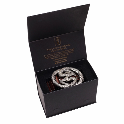 An intertwining snake belt buckle adds texture and interest to this women’s studded belt. Detailed with small domed studs on the strap and a single strap keeper to tuck in the end of the strap, the Snake Como Belt is crafted from full grain leather that gives it a rich look and feel. Graphite grey metal accents against a dark brown strap lend to its chic, contemporary appeal.